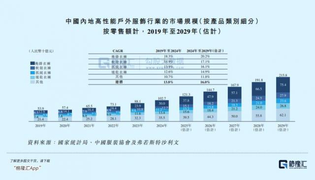 据资料显示,2024 年中国内地高性能户外服饰的市场规模达到了 1027 亿元,未来五年预计将按照 16% 的增长速度,那么 2029 年市场规模将突破两千亿。