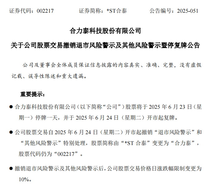6月22日晚间,*ST合泰(合力泰科技股份有限公司;证券代码:002217)发布公告称,公司股票将于6月23日停牌一天,于6月24日开市起复牌并撤销退市风险警示和其他风险警示。