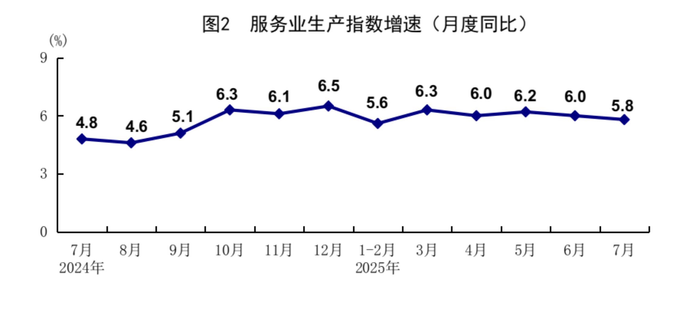 7月份,全国服务业生产指数同比增长5.8%。分行业看,信息传输、软件和信息技术服务业,金融业,租赁和商务服务业生产指数同比分别增长11.9%、8.7%、8.0%,分别快于服务业生产指数6.1、2.9、2.2个百分点。1-7月份,全国服务业生产指数同比增长5.9%。1-6月份,规模以上服务业企业营业收入同比增长7.5%。7月份,服务业商务活动指数为50.0%,服务业业务活动预期指数为56.6%。其中,铁路运输、航空运输、邮政、文化体育娱乐等行业商务活动指数位于60.0%以上高位景气区间。