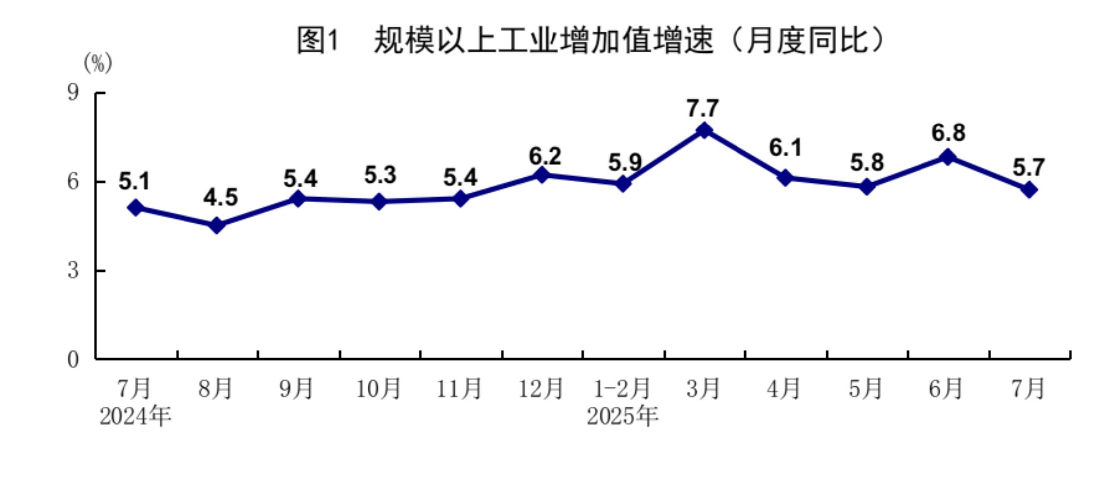 7月份,全国规模以上工业增加值同比增长5.7%,环比增长0.38%。分三大门类看,采矿业增加值同比增长5.0%,制造业增长6.2%,电力、热力、燃气及水生产和供应业增长3.3%。装备制造业增加值同比增长8.4%,高技术制造业增加值增长9.3%,分别快于全部规模以上工业增加值2.7和3.6个百分点。分经济类型看,国有控股企业增加值同比增长5.4%;股份制企业增长6.5%,外商及港澳台投资企业增长2.8%;私营企业增长5.0%。分产品看,3D打印设备、工业机器人、新能源汽车产品产量同比分别增长24.2%、24.0%、17.1%。1-7月份,全国规模以上工业增加值同比增长6.3%。7月份,制造业采购经理指数为49.3%,企业生产经营活动预期指数为52.6%。1-6月份,全国规模以上工业企业实现利润总额34365亿元,同比下降1.8%。