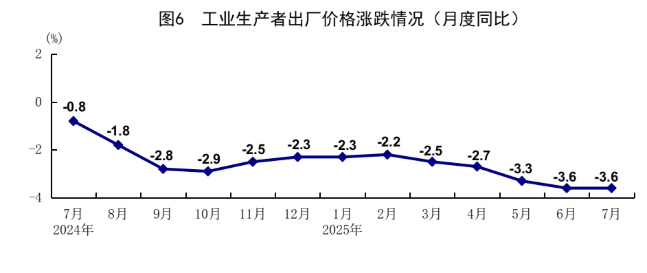7月份,全国工业生产者出厂价格同比下降3.6%,环比下降0.2%;全国工业生产者购进价格同比下降4.5%,环比下降0.3%。1-7月份,全国工业生产者出厂价格和购进价格同比分别下降2.9%、3.2%。
