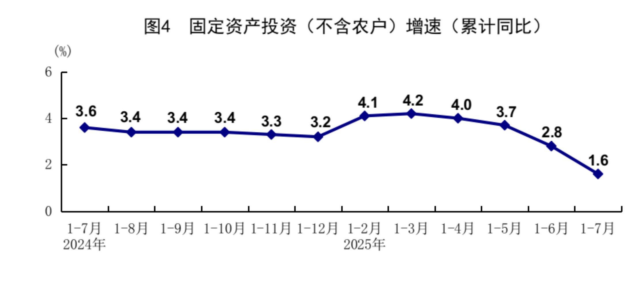 1-7月份,全国固定资产投资(不含农户)288229亿元,同比增长1.6%;扣除房地产开发投资,全国固定资产投资增长5.3%。分领域看,基础设施投资同比增长3.2%,制造业投资增长6.2%,房地产开发投资下降12.0%。全国新建商品房销售面积51560万平方米,同比下降4.0%;新建商品房销售额49566亿元,下降6.5%。分产业看,第一产业投资同比增长5.6%,第二产业投资增长8.9%,第三产业投资下降2.3%。民间投资同比下降1.5%;扣除房地产开发投资,民间投资增长3.9%。高技术产业中,航空、航天器及设备制造业,信息服务业,计算机及办公设备制造业投资同比分别增长33.9%、32.8%、16.0%。7月份,固定资产投资(不含农户)环比下降0.63%。