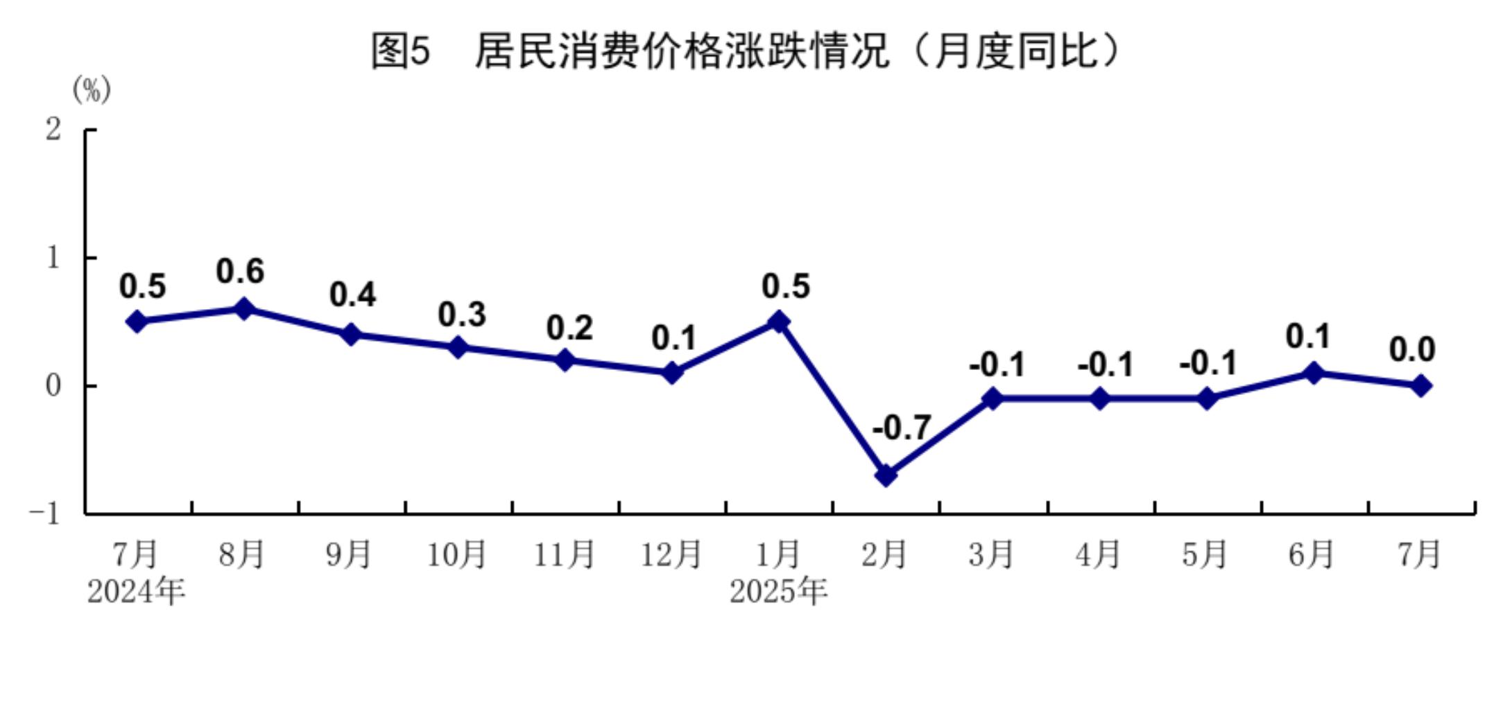 7月份,全国居民消费价格(CPI)同比持平,环比上涨0.4%。分类别看,食品烟酒价格同比下降0.8%,衣着价格上涨1.7%,居住价格上涨0.1%,生活用品及服务价格上涨1.2%,交通通信价格下降3.1%,教育文化娱乐价格上涨0.9%,医疗保健价格上涨0.5%,其他用品及服务价格上涨8.0%。在食品烟酒价格中,猪肉价格下降9.5%,鲜菜价格下降7.6%,粮食价格下降1.0%,鲜果价格上涨2.8%。扣除食品和能源价格后的核心CPI同比上涨0.8%,涨幅比上月扩大0.1个百分点。1-7月份,全国居民消费价格同比下降0.1%。
