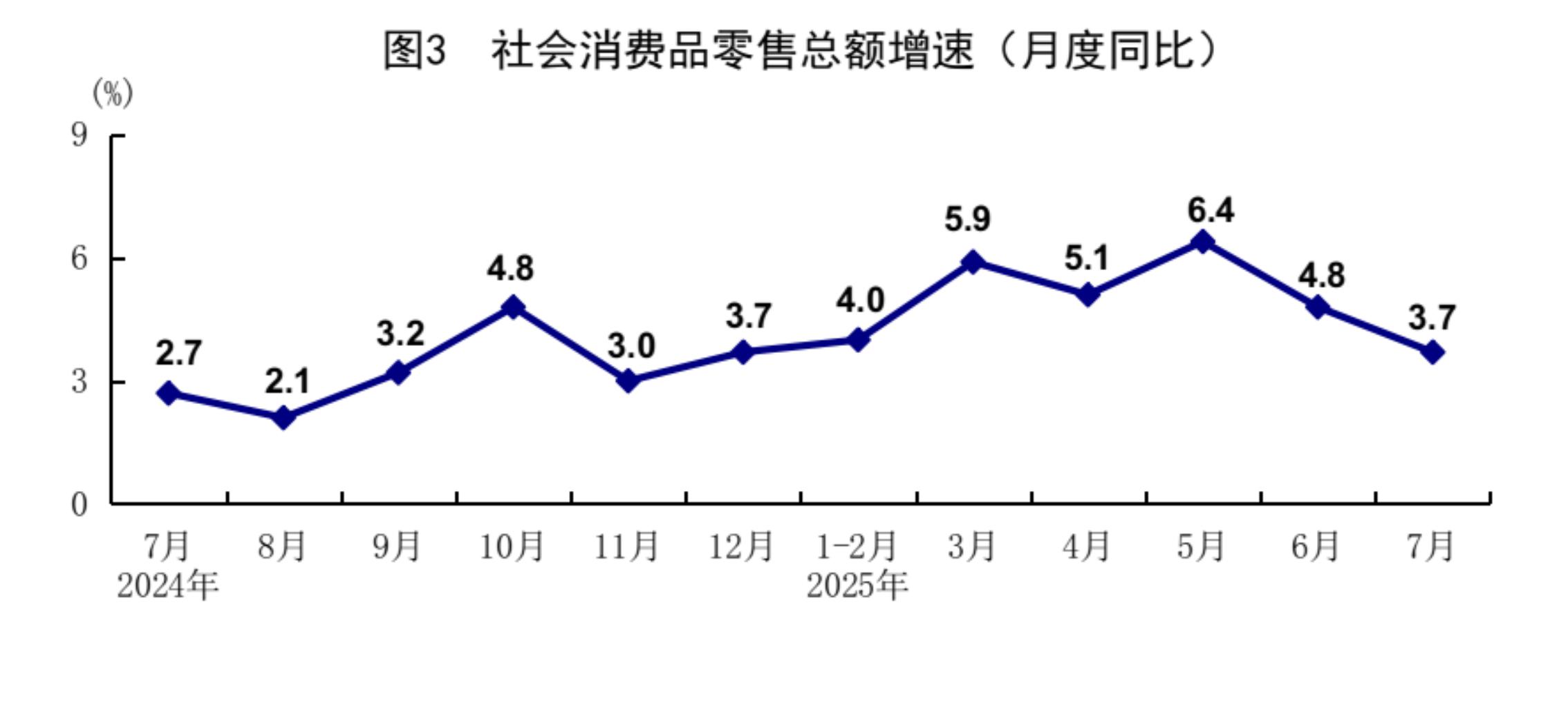 7月份,社会消费品零售总额38780亿元,同比增长3.7%;环比下降0.14%。按经营单位所在地分,城镇消费品零售额33620亿元,同比增长3.6%;乡村消费品零售额5160亿元,增长3.9%。按消费类型分,商品零售额34276亿元,增长4.0%;餐饮收入4504亿元,增长1.1%。基本生活类和部分升级类商品销售增势良好,限额以上单位粮油食品类、日用品类、体育娱乐用品类、金银珠宝类商品零售额分别增长8.6%、8.2%、13.7%、8.2%。消费品以旧换新政策持续显效,限额以上单位家用电器和音像器材类、家具类、通讯器材类、文化办公用品类商品零售额分别增长28.7%、20.6%、14.9%、13.8%。1-7月份,社会消费品零售总额284238亿元,同比增长4.8%。全国网上零售额86835亿元,同比增长9.2%。其中,实物商品网上零售额70790亿元,增长6.3%,占社会消费品零售总额的比重为24.9%。1-7月份,服务零售额同比增长5.2%。其中,文体休闲服务类、通讯信息服务类、旅游咨询租赁服务类、交通出行服务类零售额较快增长。